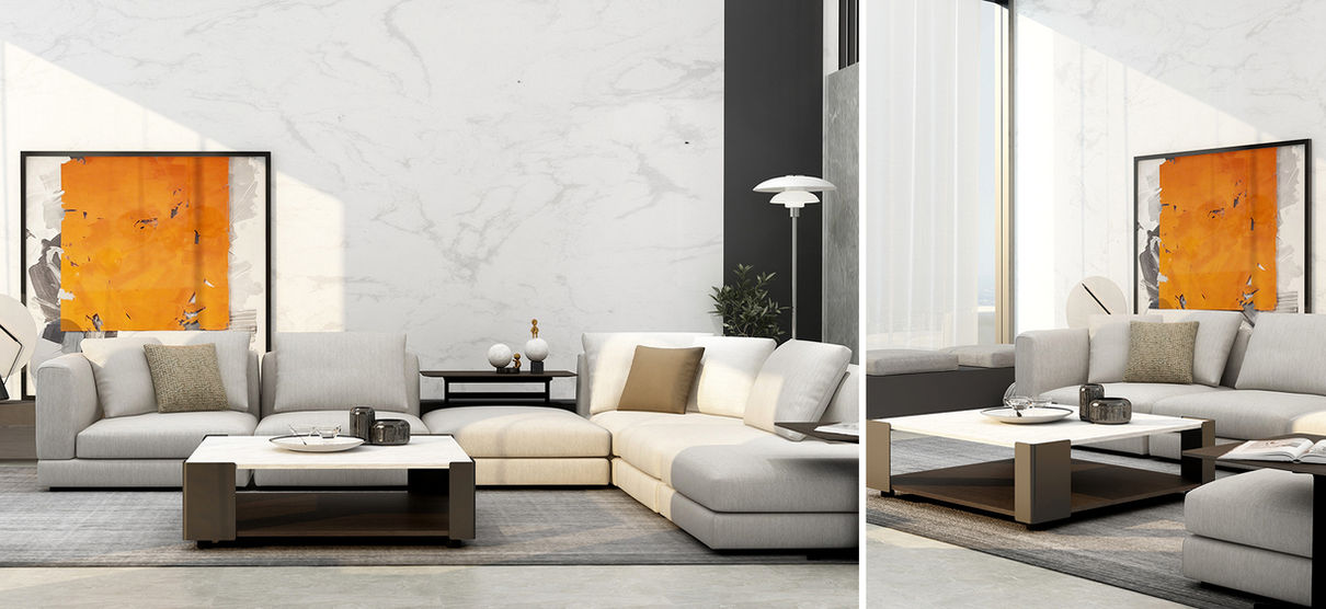 Bold, regal, and confident, Rubix Table is streamlined to perfection. Table top is available in Black or Brown Walnut Veneer, or opt for exquisite Carrara. Mystique Brown Marble is also available for 35″ version. Marble options offer beautiful veining, unique to each piece. Metal frame is luxuriously upholstered in Eco Leather and solidly supports the substantial table top. Bottom shelf is available in Black Walnut or Brown Walnut Veneer. Inset hidden ABS legs are finished in black plastic.